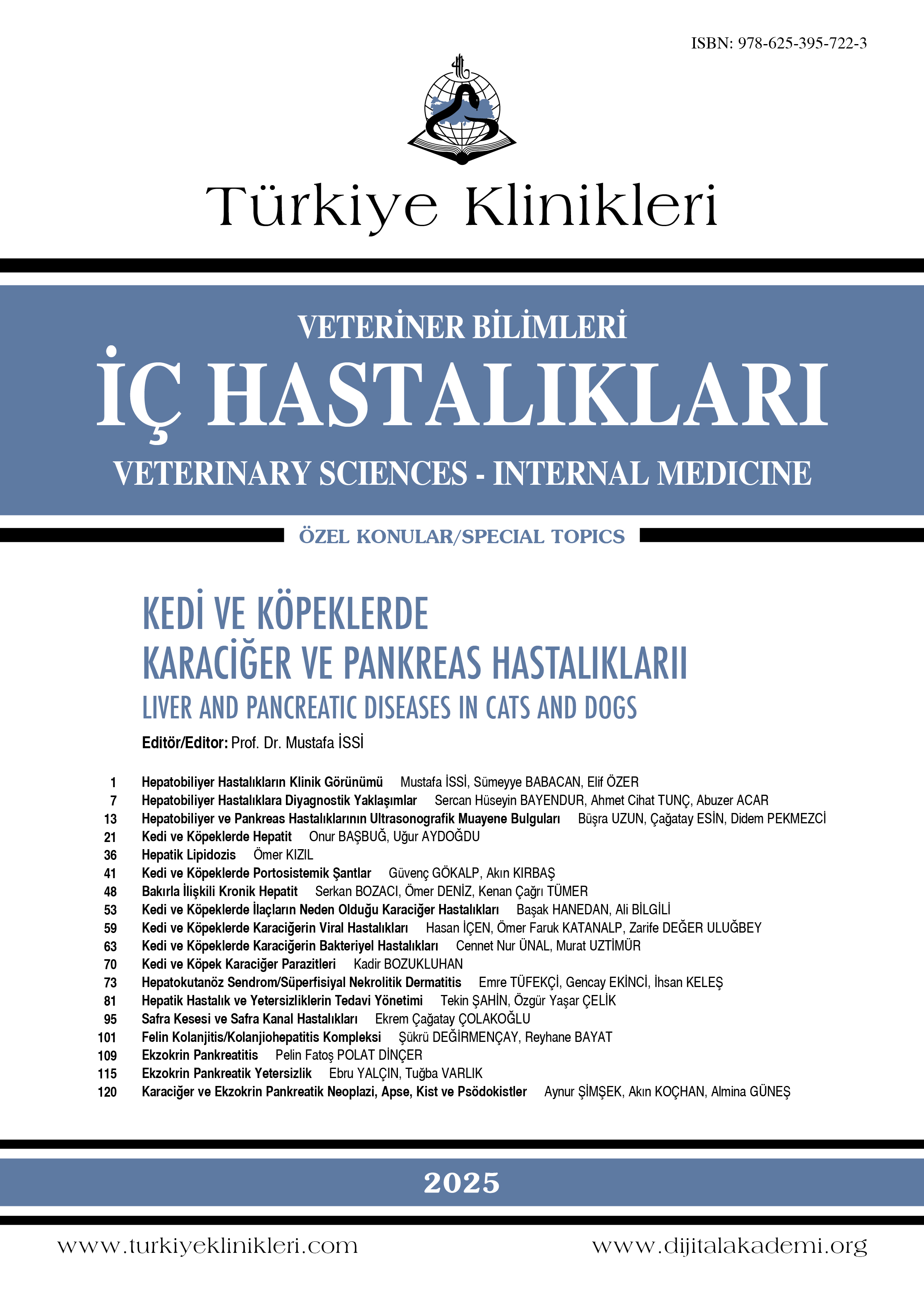 İssi M, Babacan S, Özer E. Hepatobiliyer hastalıkların klinik görünümü. İssi M, editör. Kedi ve Köpeklerde Karaciğer ve Pankreas Hastalıkları. 1. Baskı. Ankara: Türkiye Klinikleri; 2025. p.1-6.